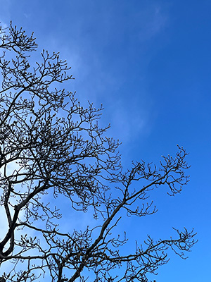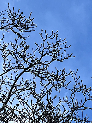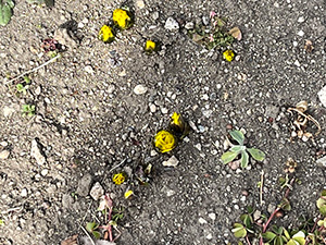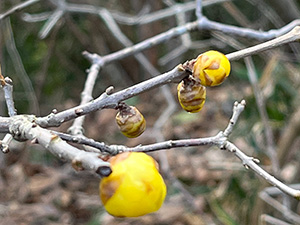 福寿草が咲き、ロウバイは鮮やかな黄色の蕾。